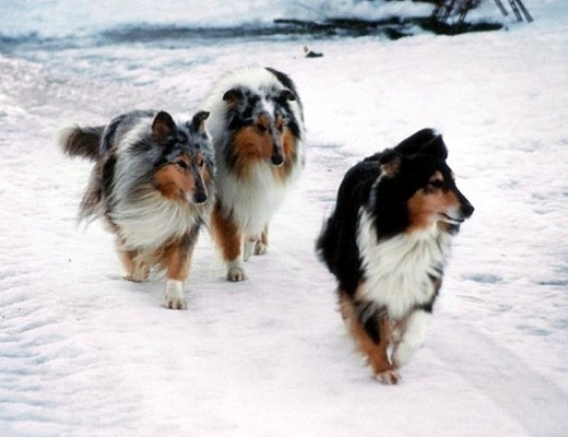| Esmari Tähdenpoika (merle), Siniketun Aerosmith (tricolour) ja Siniketun Rolling Stones (soopeli) leikkimässä, taustalla nuori Siniketun Sininen Tähti keväällä 1999. |
