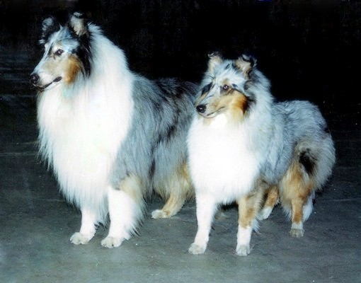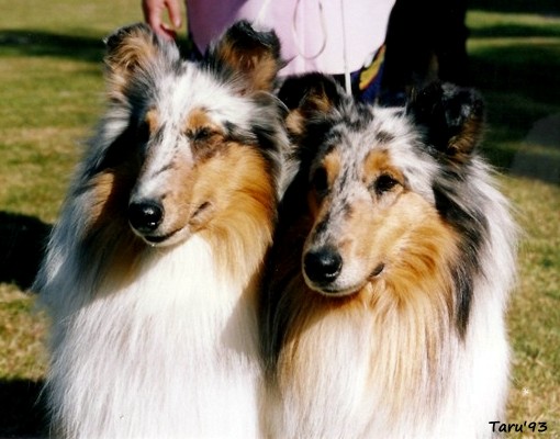| C.I.B FI EE MVA V-87-88-89 Niittykasteen Sensaatio ja tyttärensä FI MVA Siniketun SiniTimantti, Helsingin messukeskuksessa keväällä 1993, jossa Sisu oli Best In Show-veteraani ja Oona Best In Show-pentu !! |
