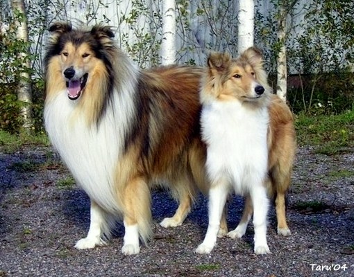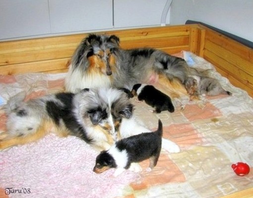 | tricolour uros Siniketun Ritari ja blue merle uros Siniketun Popeda, keväällä-06. |