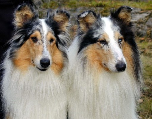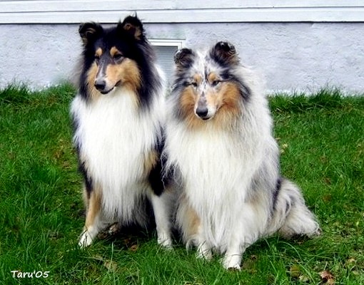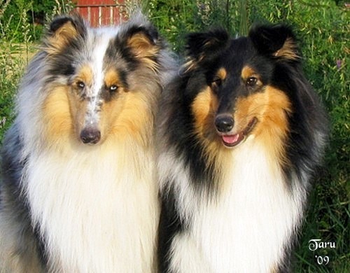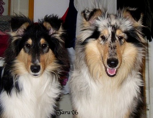 | Sisarukset, blue merle uros Ch Siniketun Hopeinen Kuu ja tricolour narttu Siniketun Helmi-Orvokki, syksyllä 2009. |