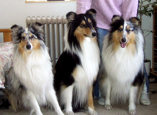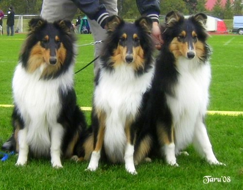 | pk collie narttu Siniketun Helmi-Orvokki, sheltti uros Ch Siniketun Brandon Lee ja pk collie uros Siniketun Hopeinen Kuu, elokuussa 2009. |