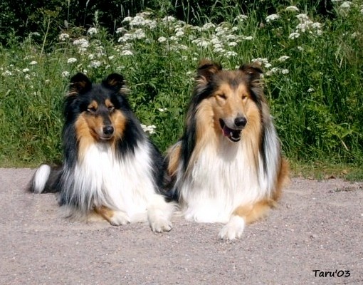 | Tricolour narttu Siniketun Miranda ja soopeli uros Dolmaris Hocus Pocus, kesällä 2003. |