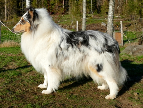 Simo on koon ylärajoilla (n. 61 cm), amerikkalaistyyppinen ja osittain nahkasukuinen, kaunislinjainen ja vahvaluustoinen, hyvin maskuliininen uros, jolla on vahva jenkkityypin pää, hyvät korvat, vahva alaleuka, kaikki hampaat ja oikea purenta. Simolla on pitkä kaula, hyvä rakenne, oikein kannettu pitkä häntä, vapaat liikkeet sekä todella runsas, runkoa myötäilevä turkki ja puhtaan sininen blue merle-väri. Simo on Mh merle, ominaisuus joka tekee vaalean hopeisen merlevärin tässä linjassa. Simo ei ole valkotekijäinen. |